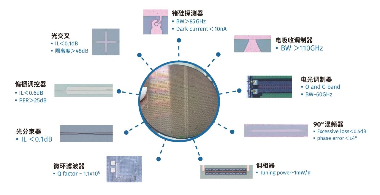 目前 8 英寸硅光平台成熟稳定,12 英寸全国产化的硅光平台也已向部分客户开放,其在器件最小尺寸、性能和良率等方面均优于8英寸硅光平台;同时已建成薄膜铌酸锂、低损耗 SiN 流片平台,全方位满足多样化流片需求。