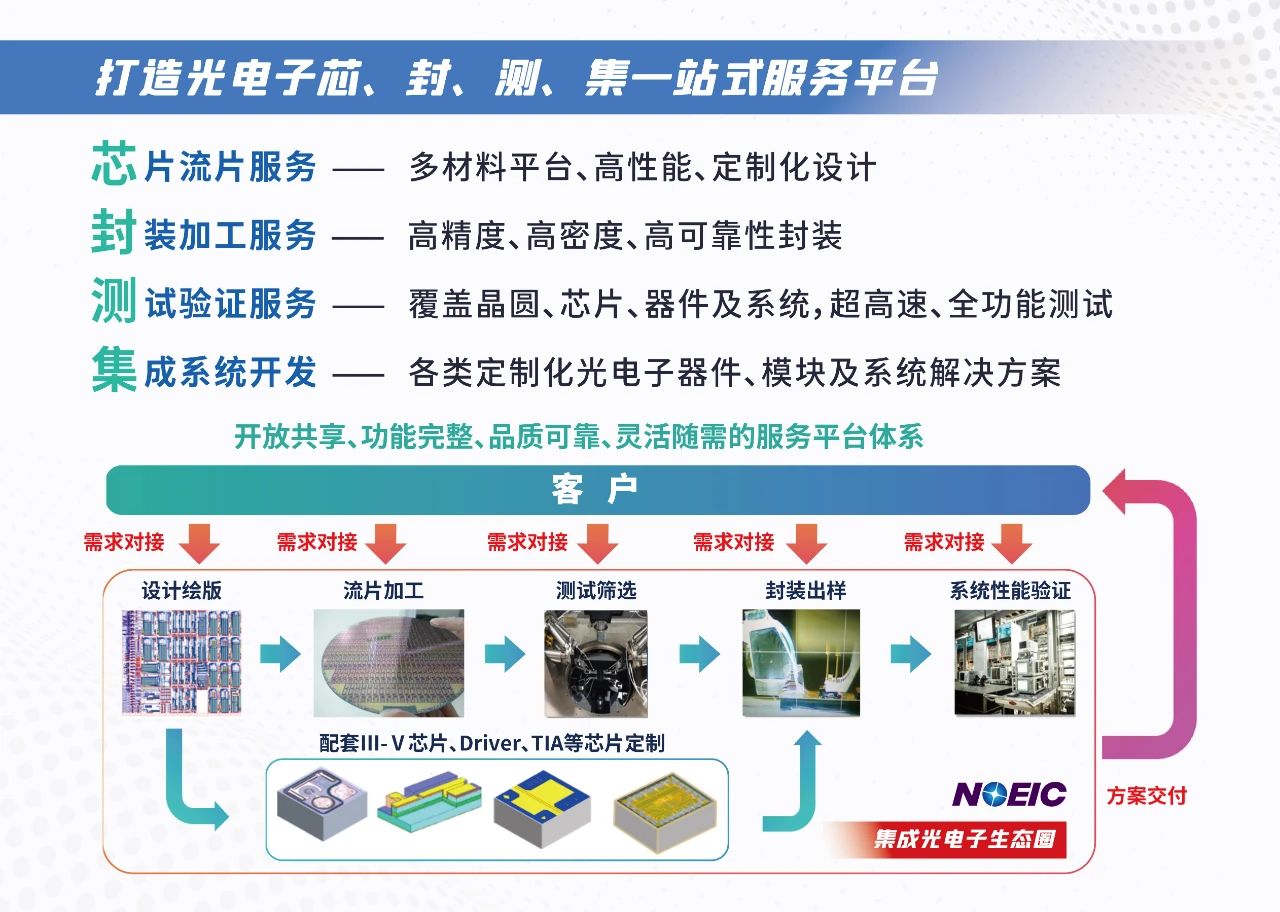 为补齐国内硅光产业链的弱势环节,NOEIC始终聚焦硅光芯片关键共性技术攻关。围绕这一目标,现已搭建起硅基光电子芯片一站式服务平台,涵盖流片、测试、封装验证及定制化集成器件四大核心模块,旨在为学术界和产业界提供开展高端光电子芯片研发的全流程支撑,加速创新成果转化与应用推广。