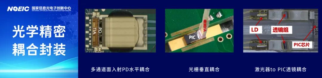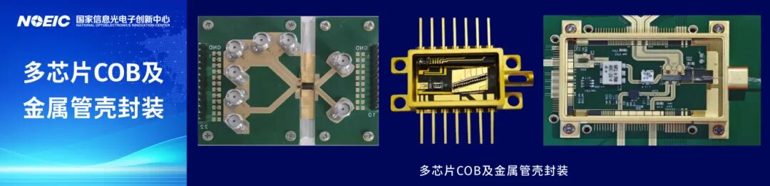NOEIC封装加工服务具备多品种高精密光耦合、多芯片精密贴装、芯片三维堆叠和高速高带宽互连等光电混合集成先进封装制造能力,同时对光电器件封装中所涉及的光、电、热、力多物理场仿真设计具有丰富的工程经验。目前,可实现16通道及以上阵列多通道高精密光耦合的COB封装、光电带宽达110GHz以上的气密封装及高密度集成的2.5D/3D先进光电器件混合集成等多种封装样件研制及小批量生产制造,形成了覆盖晶圆级分析测试、芯片分选、性能测试、组装封装、环境可靠性试验等全流程的光电子混合集成封装能力。 典型案例