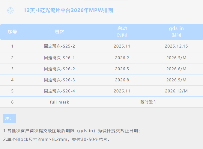 为应对市场快速迭代的挑战,满足行业对技术开发效率与确定性的更高要求,NOEIC现正式发布2026年(含2025年底)MPW流片排期计划。我们将通过系统资源规划与流程优化,提升平台运行效率,缩短流片周期,以稳定可靠的服务支持前沿硅光芯片研发与创新。