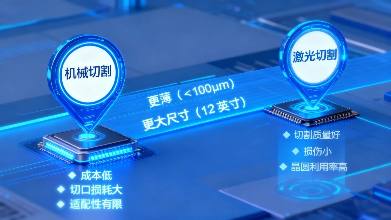 但随着芯片技术升级,晶圆逐渐向 “更薄(<100μm)、更大尺寸(12 英寸)” 演进,先进封装技术(如 Chiplet、WLCSP)对切口宽度提出更严苛要求。机械切割存在的机械应力、切口损耗大、适配性有限等短板愈发明显,难以满足高端芯片与特殊材料的加工需求。激光非接触切割凭借无应力优势,可有效避免崩边、裂纹等损伤,其中光隐形切割的切口宽度仅为机械切割的 1/3,大幅提升晶圆利用率,成为技术迭代的核心方向。